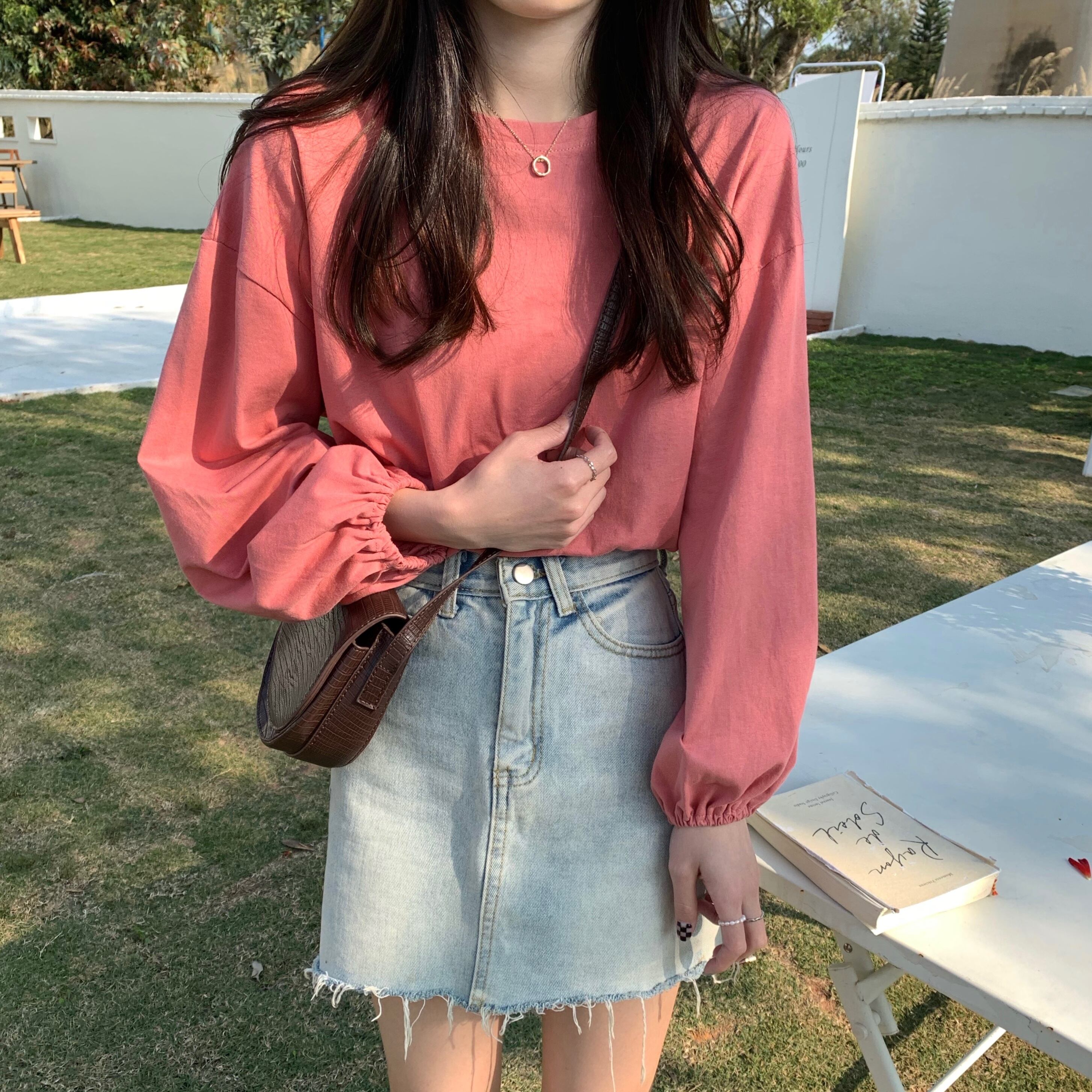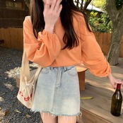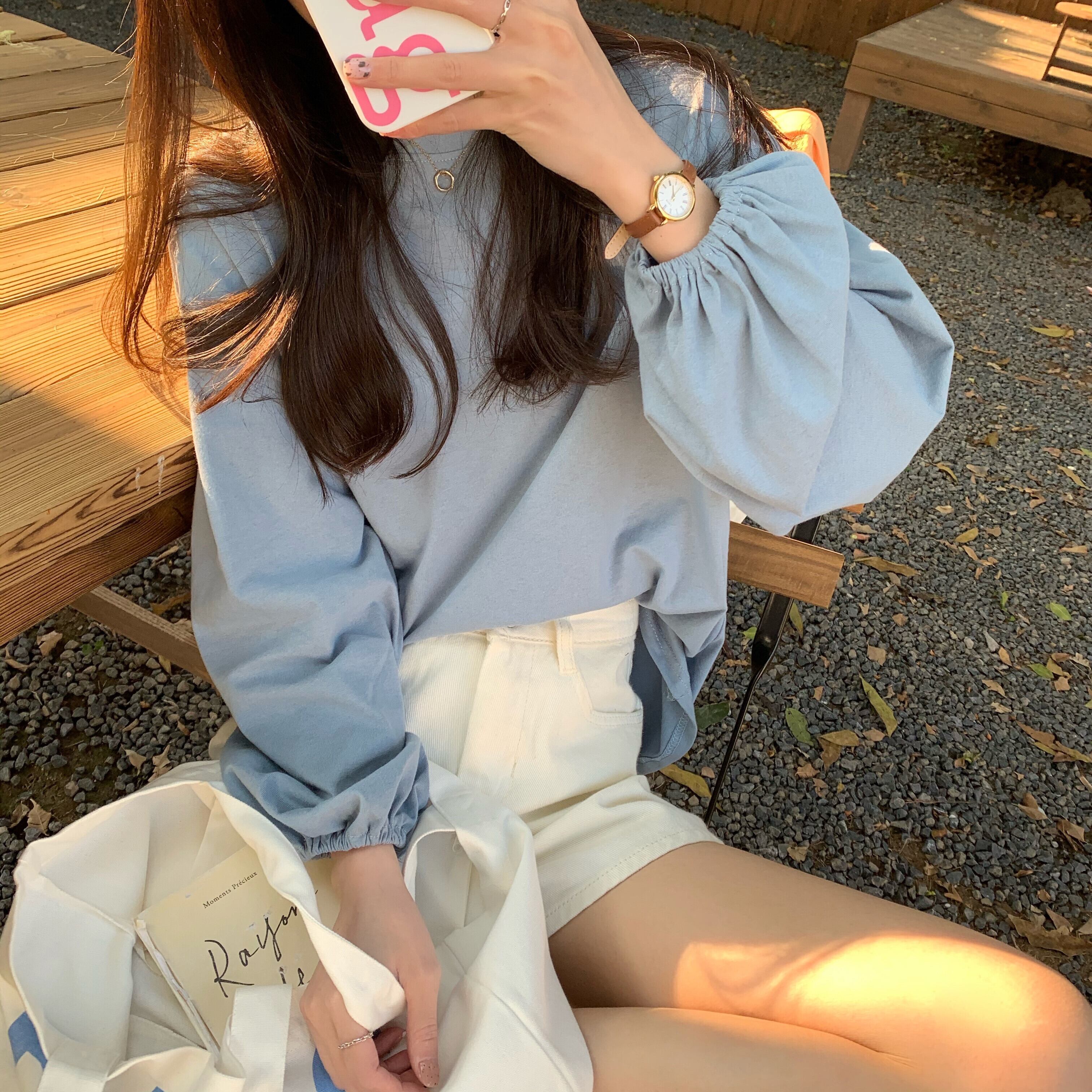 こちらはオールシーズンに活躍する袖ありの長袖で、どんなシーンにも対応可能。ラウンドネックで襟なし、どんなボトムとも好相性です。かわいいだけではなく、大人のカジュアルシーンでも使えます。伸縮性抜群で着心地も抜群。季節を問わず、あなたのおしゃれに欠かせない一枚です。