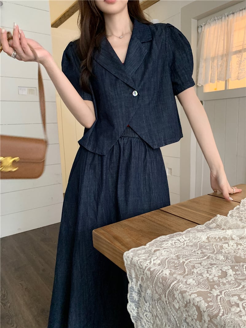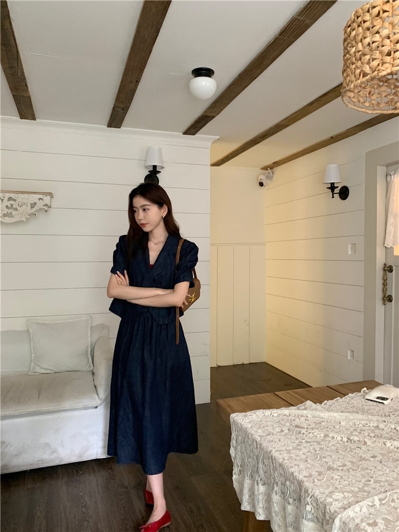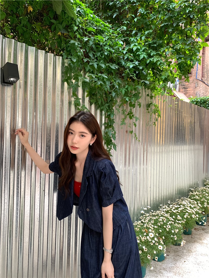 このスカートセットアップは、大人可愛いシンプルなデザインが魅力です。上下セットで揃えば、着こなしも簡単に決まります。ロング丈でミモレ丈のスカートは、女性らしいフェミニンな印象を与え、袖ありのジャケットは、程よいカジュアル感を出してくれます。春夏にぴったりの清涼感あるブルー色も魅力的です。