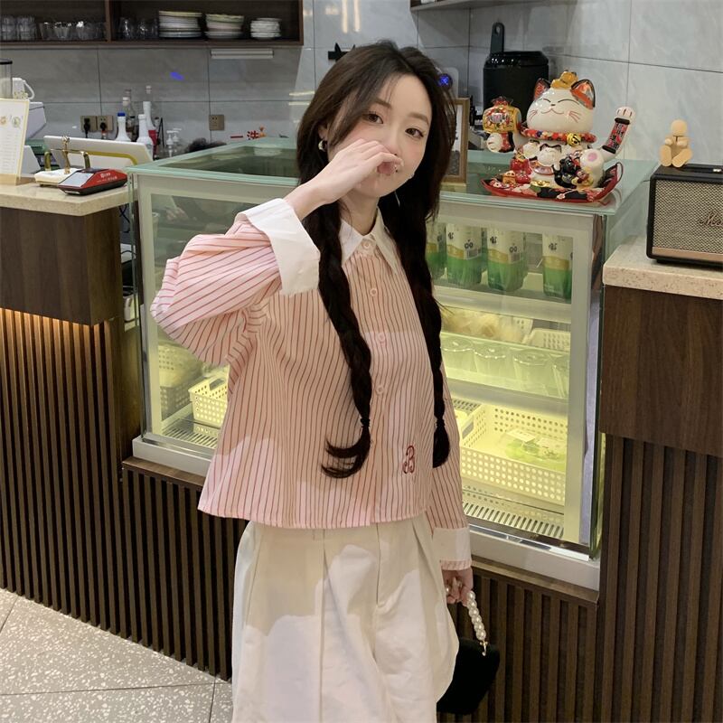 送料無料 トップス シャツ ショート丈 袖あり 長袖 襟付き スタンドカラー ワイド 前開き かわいい 大人可愛い きれいめ シンプル カジュアル 上品 おしゃれ お洒落 大人女子 こなれ感 ラフ ラブリー キュート ガーリー クール 主役級 柄 ストライプ 春 秋 10代 20代 30代