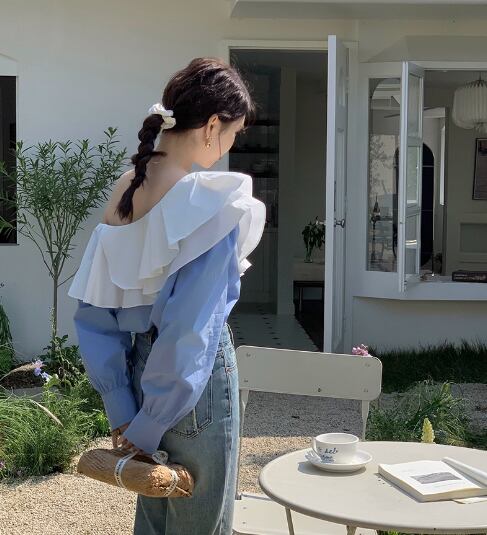 送料無料 トップス シャツ プルオーバー 袖あり 長袖 ボリューム袖 ドロップショルダー ワンショルダー 襟付き ドールカラー 切り替えデザイン フリル バックシャン バックコンシャス ふわふわ かわいい おしゃれ お洒落 大人女子 ガーリー ルーズ セクシー 主役級 存在感