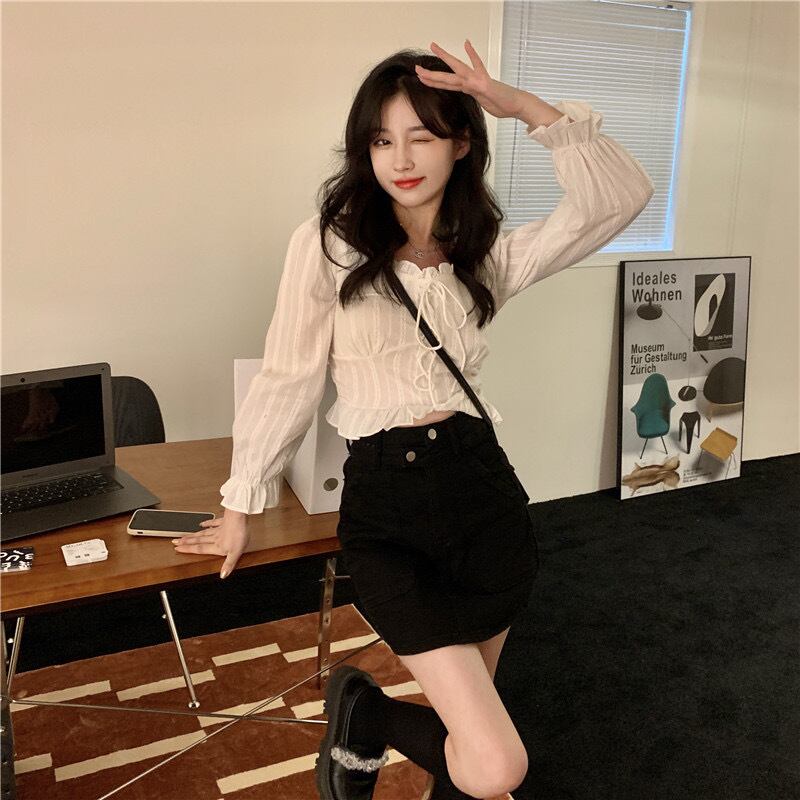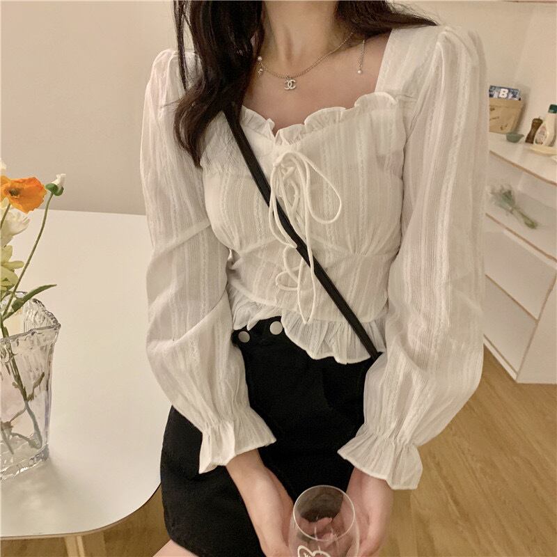 トップス シャツ ショート丈 袖あり 長袖 スクエアネック 襟なし スリム 細身 フリル リボン プルオーバー 薄手 大人可愛い きれいめ シンプル カジュアル 大人 上品 お洒落 かっこいい レトロ 大人女子 こなれ感 ラフ ラブリー キュート ガーリー 主役級 存在感 とろみ感 抜け感 無地 春 10代 20代 レディース デート お出かけ 女子会 お泊まり 休日 旅行 ホテル ガーデン レストラン ショッピング 普段使い 韓国系 オルチャン コーデ モテ トレンド 流行 ワンサイズ ホワイト ブルー
