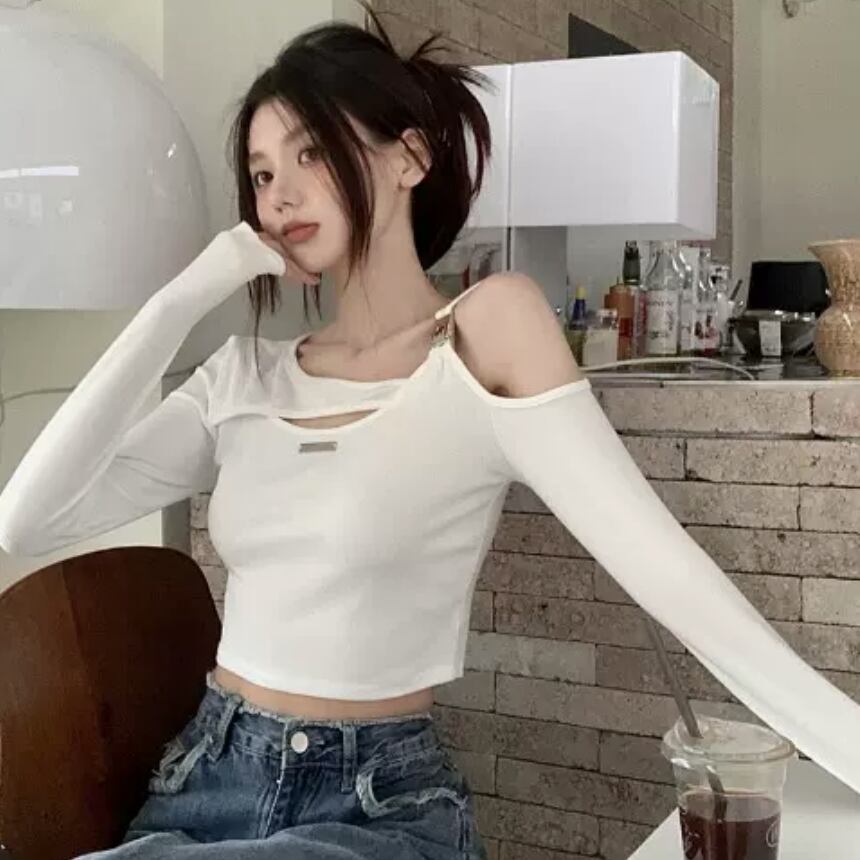 トップス カットソー 白トップス ショート ショート丈 袖あり 長袖 スリム タイト 細身 かわいい 大人可愛い きれいめ シンプル カジュアル 上品 おしゃれ お洒落 かっこいい レトロ 大人女子 こなれ感 ラフ ラブリー キュート ガーリー ルーズ 個性的 クール モード系