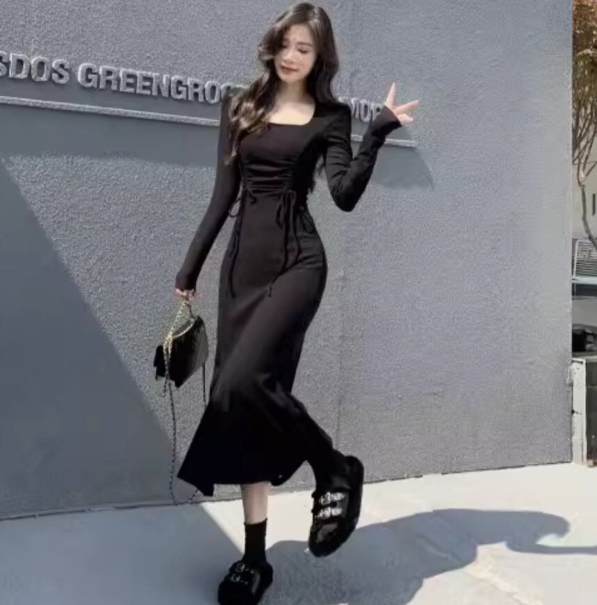送料無料 レディース ワンピース ドレス ロング 長袖 スリム 細身 無地 シンプル マーメイド フィッシュテール 大人可愛い きれいめ シンプル ガーリー フェミニン エレガント シャーリング ドローストリング デイリー お出かけ お呼ばれ デート 送料無料