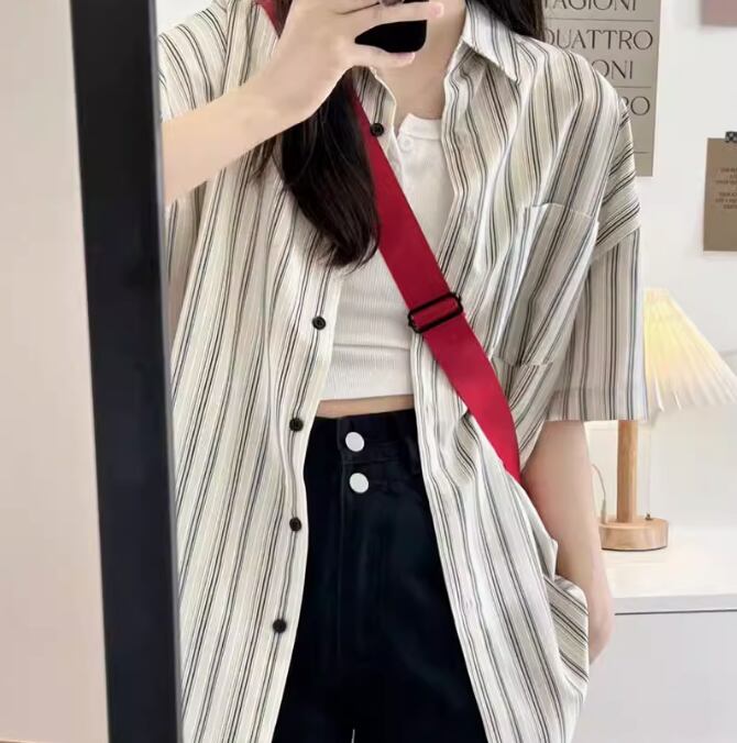 送料無料 レディース トップス シャツ ブラウス ミモレ 半袖 ストライプ かわいい 大人可愛い きれいめ シンプル カジュアル おしゃれ かっこいい レトロ こなれ感 ラフ メンズライク ゆったり ゆる オーバーサイズ デイリー お出かけ アプリコット 送料無料
