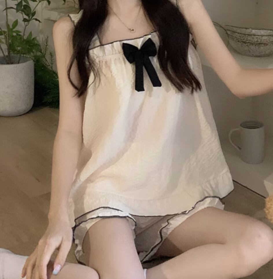 送料無料 レディース ルームウェア パジャマ ノースリーブ ショートパンツ Aライン リボン フリル シボ加工 無地 シンプル 大人可愛い きれいめ カジュアル 上品 おしゃれ レトロ こなれ感 抜け感 リラックス ラフ ガーリー ラブリー キュート 送料無料