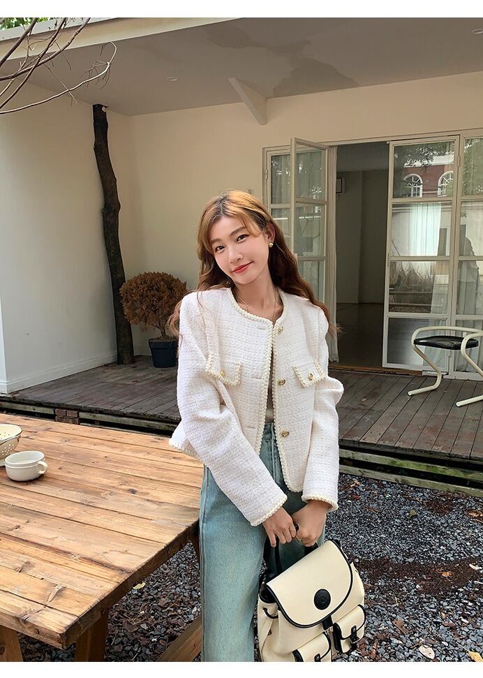 ジャケット ノーカラージャケット 長袖 ラウンドネック 襟なし ノーカラー ボタンダウン ストレート フェミニン ポケット 前開き ツイード ボタン ツイード ウール かわいい 大人可愛い きれいめ シンプル 上品 おしゃれ かっこいい こなれ感 ガーリー モード系 エレガント