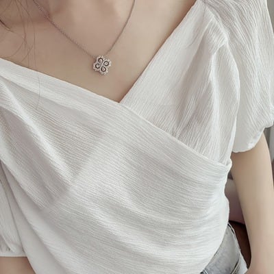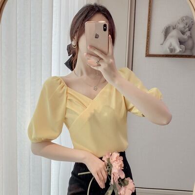 トップス ブラウス カットソー 半袖 パフスリーブ バルーン袖 Vネック 襟なし ラップ フェミニン シフォン 透け感 シースルー 薄手 シアー かわいい 大人可愛い きれいめ シンプル カジュアル 上品 おしゃれ こなれ感 ガーリー クール モード系 エレガント フォーマル