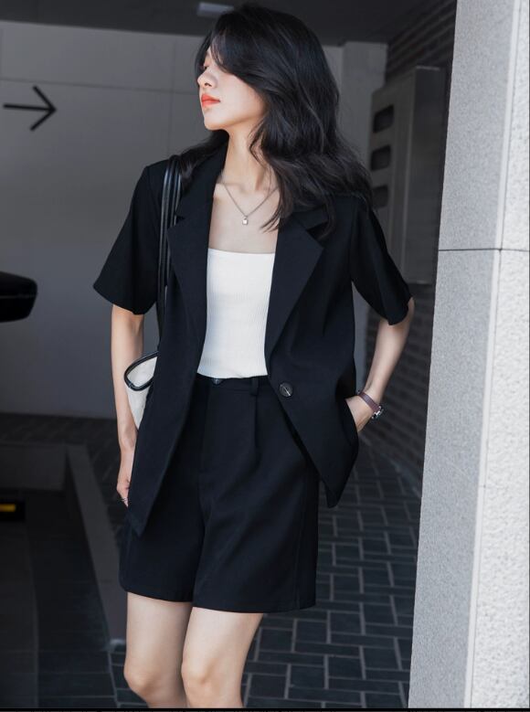 レディース ジャケット パンツ ボトムス スーツ セットアップ 上着 前開き ショートパンツ 半袖 襟付き ストレート ポケット ハイウエスト ポリエステル きれいめ シンプル 上品 おしゃれ かっこいい こなれ感 クール 都会的 無地 春 夏 お出かけ 休日 ショッピング カフェ