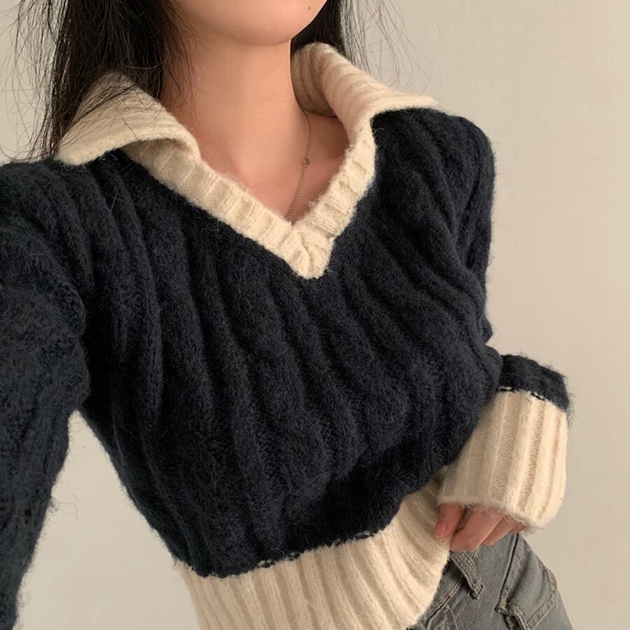 トップス ニット セーター プルオーバー 長袖 Vネック 襟付き 角襟 ストレート ストリート リブニット 伸縮性 バイカラー 中厚手 ストレッチ かわいい 大人可愛い きれいめ シンプル カジュアル 上品 おしゃれ かっこいい レトロ こなれ感 ラフ マニッシュ ボーイッシュ