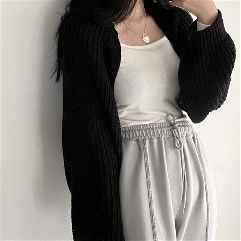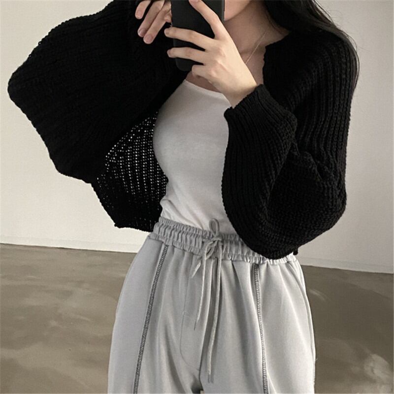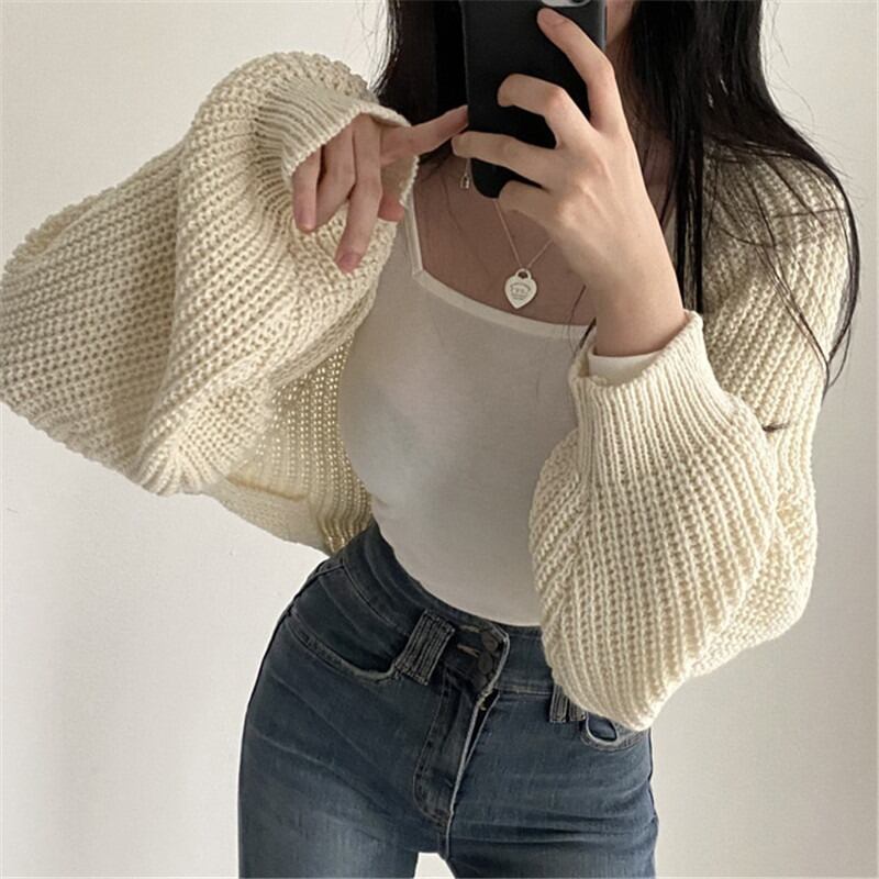 ニット カーディガン ショート 長袖 ボリューム袖 ワイド フェミニン ストリート 前開き ケーブルニット 伸縮性 ニット かわいい 大人可愛い きれいめ シンプル カジュアル 上品 おしゃれ かっこいい レトロ こなれ感 ラフ マニッシュ ルーズ 個性的 クール モード系