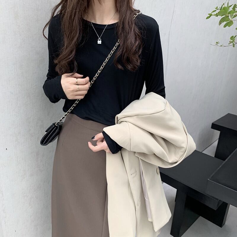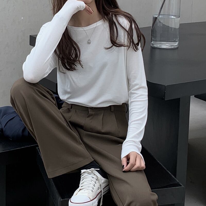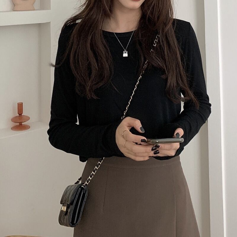 定番アイテムのロンT、フェミニンさとストリート感を両立させています。伸縮性のある素材で、着心地も抜群です。大人可愛い雰囲気を演出してくれる一枚。