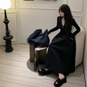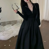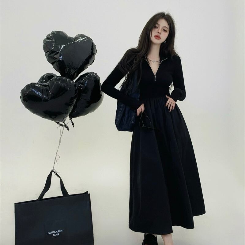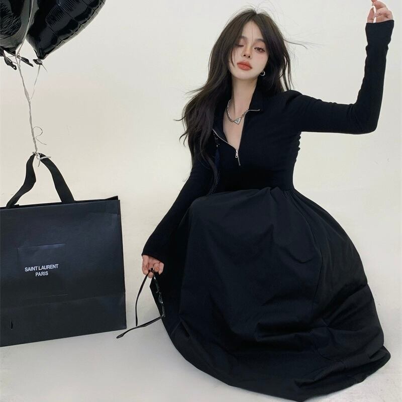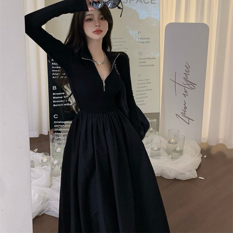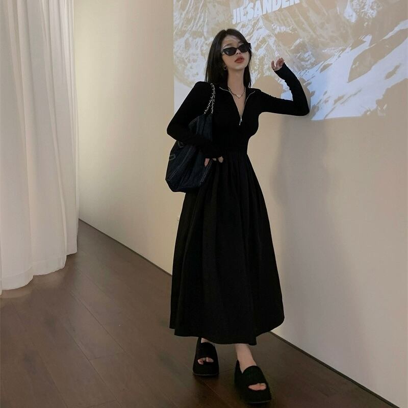 レディース ワンピース ロング丈 ロングワンピース 袖あり 長袖 Vネック ハイウエスト 無地 ジッパー スリム 細身 大人可愛い きれいめ シンプル カジュアル 大人 上品 お洒落 かっこいい レトロ 大人女子 こなれ感 ラフ クール モード系 エレガント モダン 主役級 存在感 とろみ感 抜け感 春 20代 30代 40代 デート お出かけ 女子会 お泊まり 休日 ショッピング 普段使い デイリー 韓国 韓国系 オルチャン ファッション コーデ スタイル トレンド 流行 美脚 S M L 黒 ブラック